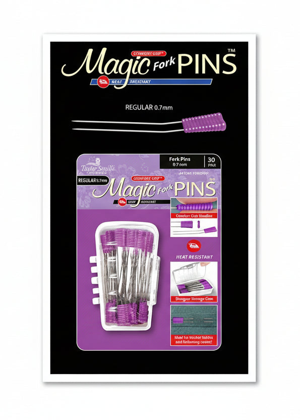 Make your sewing projects smoother with Taylor Seville Magic Fork Pins. These 0.7mm heat-resistant pins feature patented comfort grip handles that provide a secure, easy hold—perfect for handling thicker fabrics and matching seams. The 2” pins come in a designer storage case to keep them organized and accessible, making them ideal for quilting, sewing, and crafting.