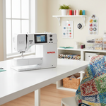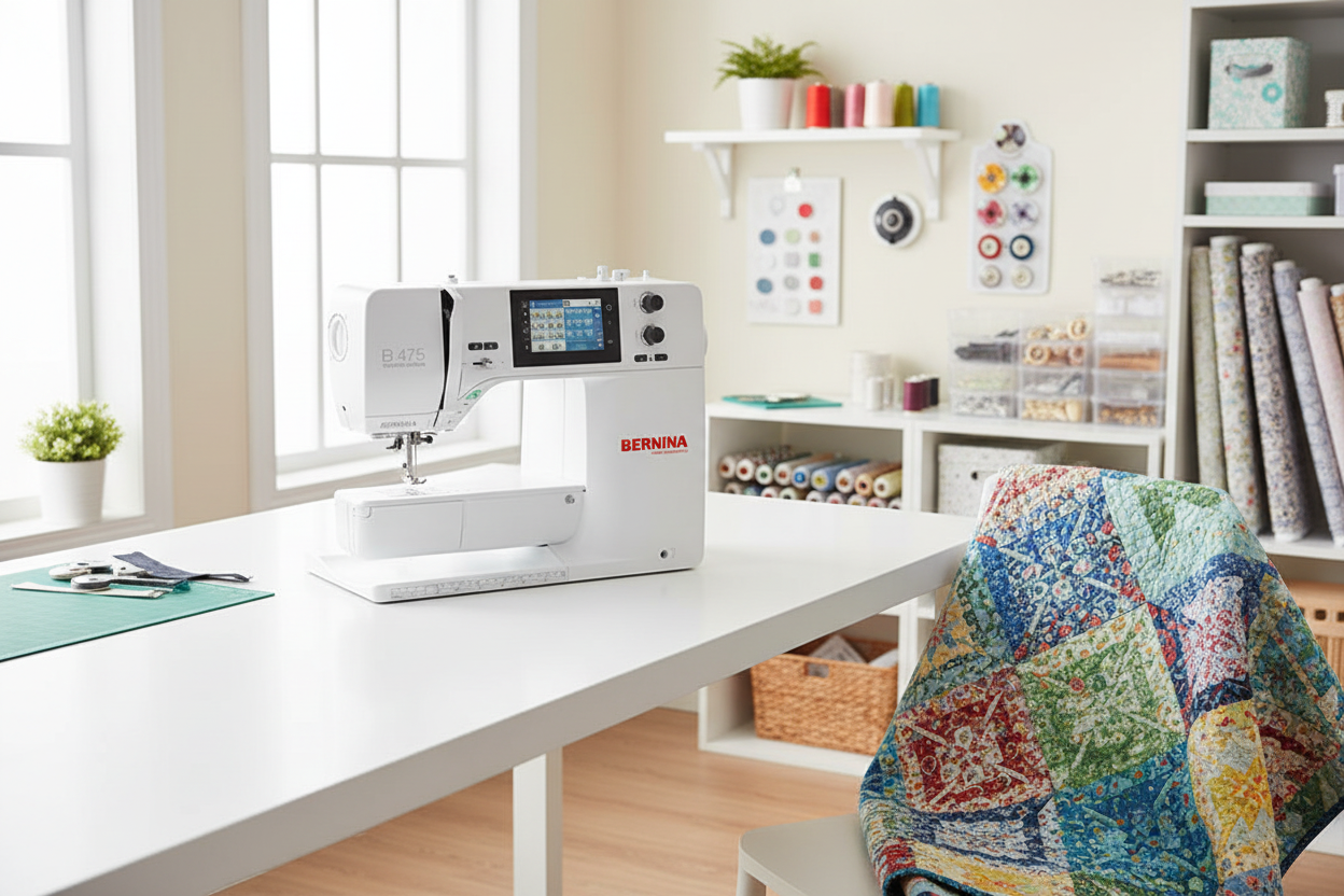 The BERNINA 475 QE is a versatile sewing and quilting machine with over 500 built-in stitches, a large touchscreen, and a spacious work area. It features an automatic thread cutter and precise needle positioning for accurate, smooth quilting and sewing.